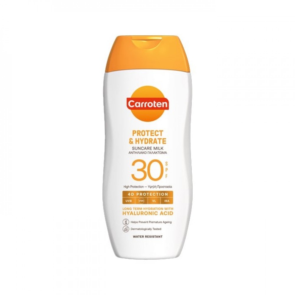 Το Carroten πηγαίνει την αντηλιακή προστασία ένα βήμα μπροστά προσφέροντας ολιστική 4D προστασία απέναντι στις 4 πιο επιβλαβείς για την επιδερμίδα ακτινοβολίες (UVA+UVB+VL*+IRA).Το αντηλιακό γαλάκτωμα, Carroten Protect & Hydrate SPF30, προσφέρει ενισχυμένη προστασία στην επιδερμίδα, στοχεύοντας στο μεγαλύτερο φάσμα όλων των ηλιακών ακτίνων. Με ανάλαφρη, μη λιπαρή, ενυδατική υφή, για βαθιά ενυδάτωση, ταχεία απορρόφηση και μοναδικά απαλή επιδερμίδα.
